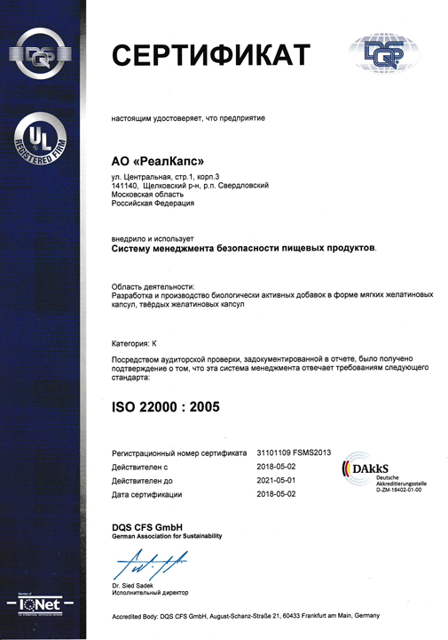 Получен сертификат, подтверждающий соответствие стандарту системы менеджмента безопасности пищевых продуктов ISO 22000:2005.