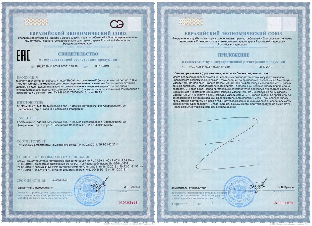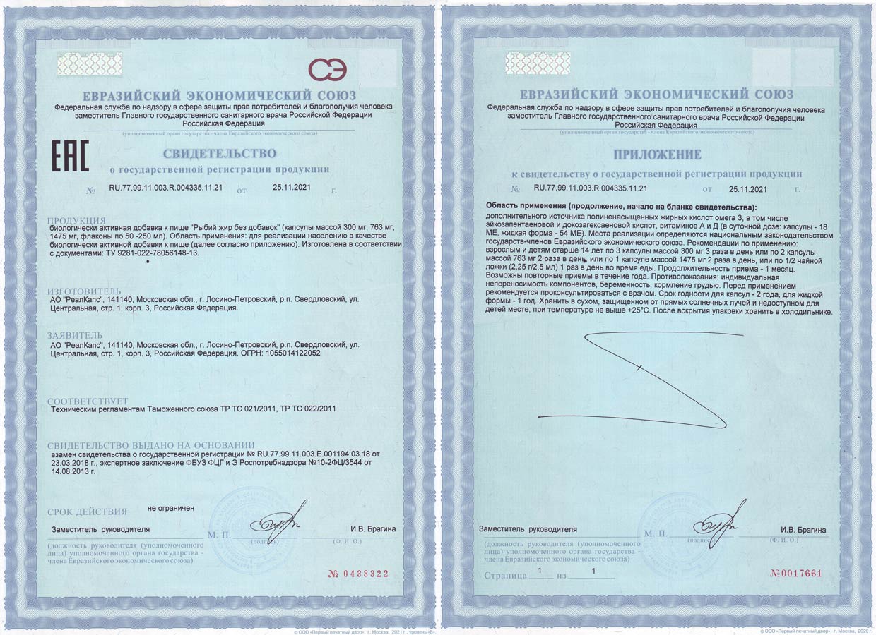 БАД к пище «Рыбий жир очищенный» зарегистрирована Федеральной службой по надзору в сфере защиты прав потребителей и благополучия человека. Свидетельство о государственной регистрации № RU.77.99.11.003.R.003715.10.19 от 08.10.2019 года, ТУ 9281-023-78056148-13 с изменениями №1, №2.