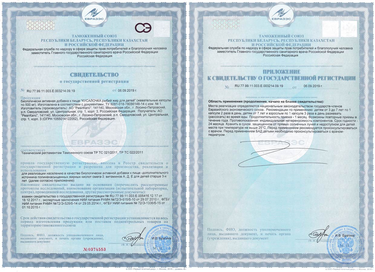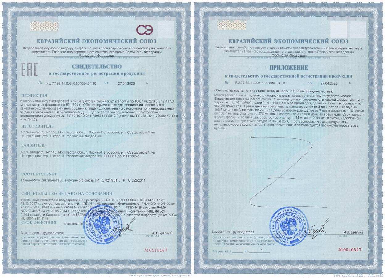 БАД к пище «Детский рыбий жир» зарегистрирована Федеральной службой по надзору в сфере защиты прав потребителей и благополучия человека. Свидетельство о государственной регистрации № RU.77.99.11.003.Е.005414.12.17 от 18.12.2017 года ТУ 9281-011-78056148-2014.